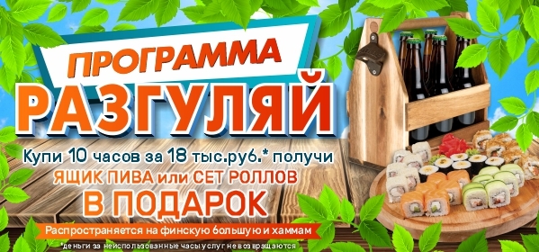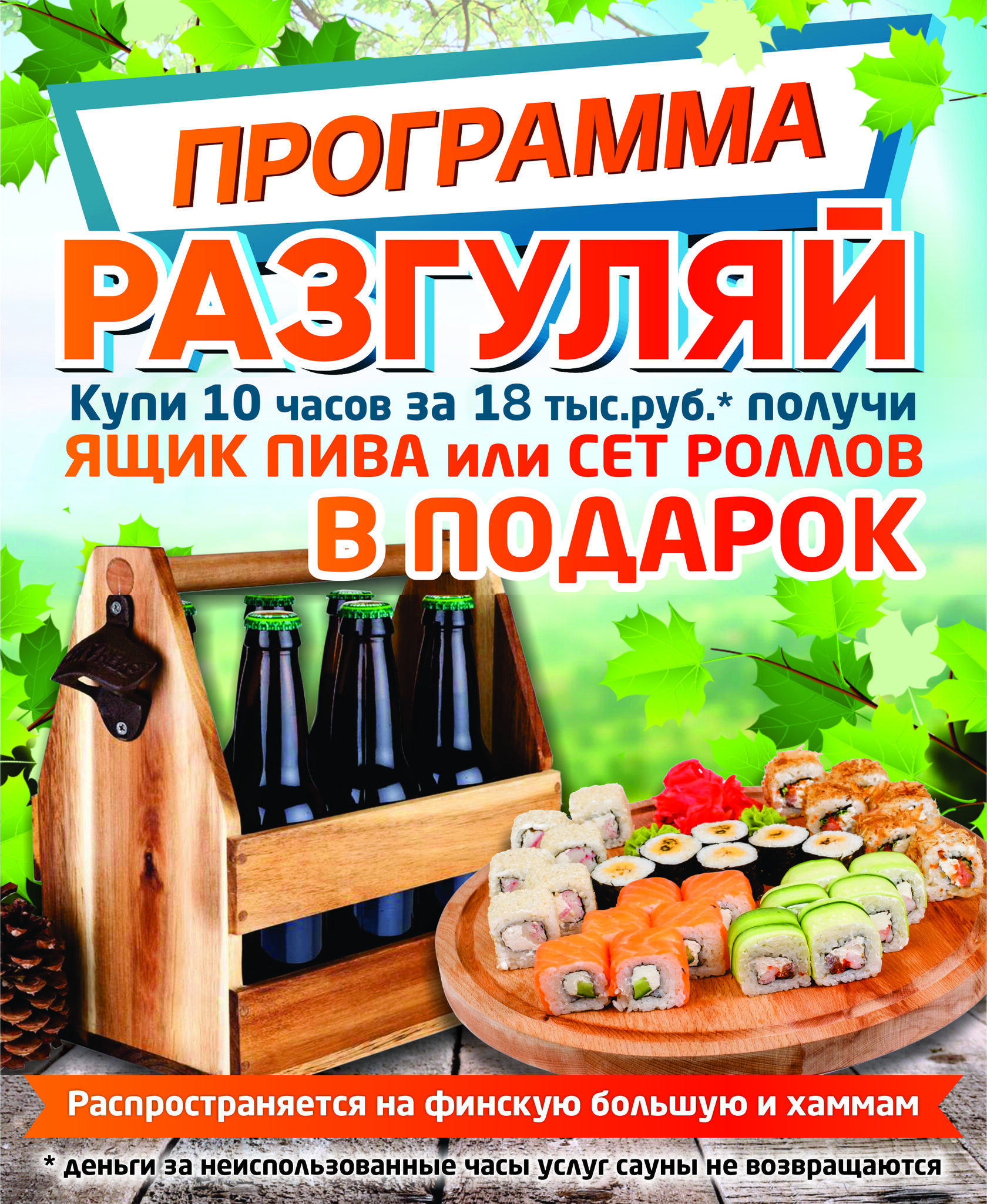- Акция 5 + 1. Для больших саун на 10 персон. Приобретая в аренду одну из саун на 5 и более часов, 6-ой час вы получаете бесплатно; - Именинникам 10 % скидка +- 5 дней от даты! Для больших саун на 10 персон - Среда "Караоке день бесплатно" - Программа "РАЗГУЛЯЙ" арендуй большую сауну на 10 часов за 18.000 руб. Выбери подарок: ящик пива или сет роллов. Акции между собой не суммируются